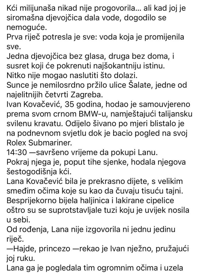 Lana Kovačević, šestogodišnja devojčica iz jedne od najelitnijih zagrebačkih četvrti, nije mogla govoriti. Njena fizička zdravost nije bila ugrožena, ali psihološka blokada sprečavala je da izgovori i jednu jedinu reč. Njena borba nije bila vidljiva spolja, a bogatstvo njenog oca, Ivana Kovačevića, poznatog poduzetnika, nije moglo da otkloni unutrašnju prepreku.