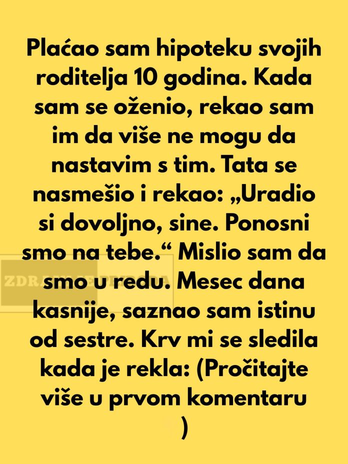 Plaćao sam hipoteku svojih roditelja 10 godina. Kada sam se oženio, rekao sam im da više ne mogu da nastavim. Tata se nasmešio i rekao: „Uradio si dovoljno, sine. Ponosni smo na tebe.“ Mislio sam da smo u redu.