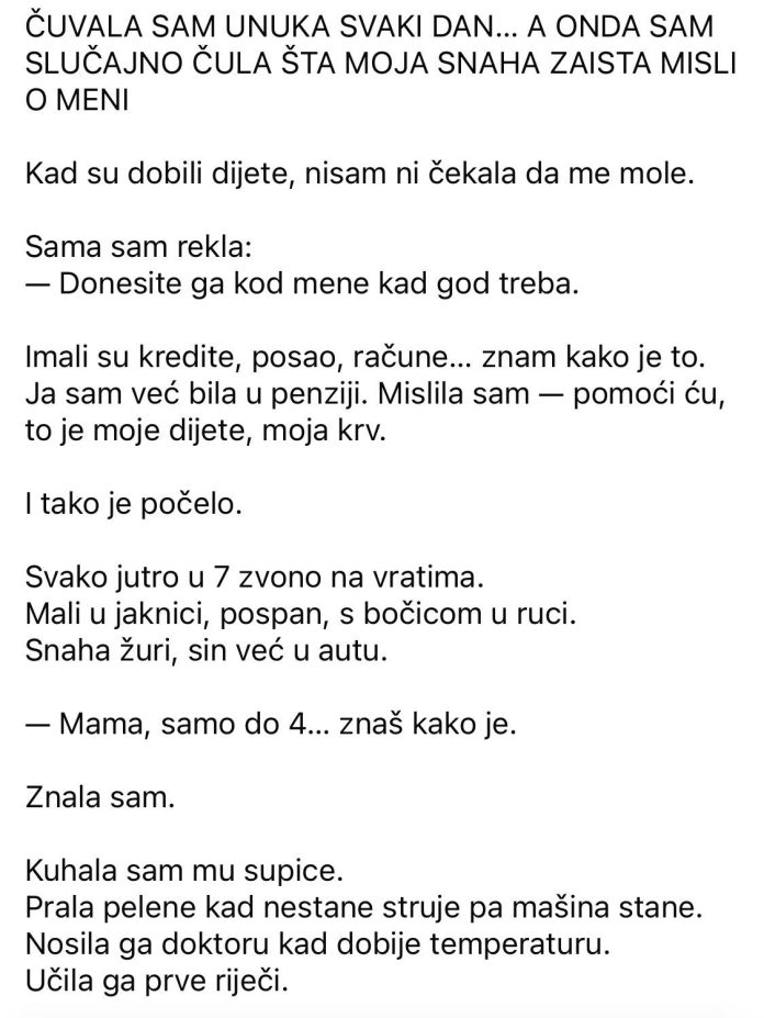 “…ma dobro je, svekrva ga čuva svaki dan. Da nema nje, morali bismo plaćati vrtić. Ovako nam džabe služi.” Džabe služi. Te dvije riječi. Kao da me neko udario šakom u grudi. Sjedila sam.