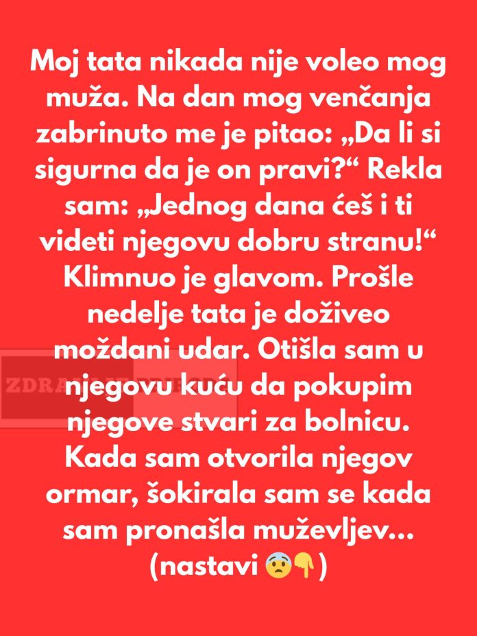 Kasnije sam otišla u kuću svojih roditelja da uzmem neke tatine stvari za bolnicu. Kada sam otvorila njegovu fioku, šokirala sam se kada sam pronašla mnogo fotografija mog muža pored fotografija naše dece. Znam koliko je tata cenio fotografije i čuvao samo one koje je zaista voleo blizu sebe. To mi je dokazalo da su godine učinile svoje — da je prihvatio mog muža, zavoleo ga i u njemu video ono dobro. Srećna sam što mogu da kažem da je tatina intuicija ovog puta ipak bila pogrešna.