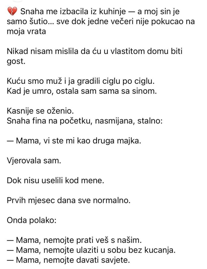 💔 Snaha me izbacila iz kuhinje — a moj sin je samo šutio… sve dok jedne večeri nije pokucao na moja vrata Nikad nisam mislila da ću u vlastitom domu biti gost. Kuću smo muž i ja gradili ciglu po ciglu.