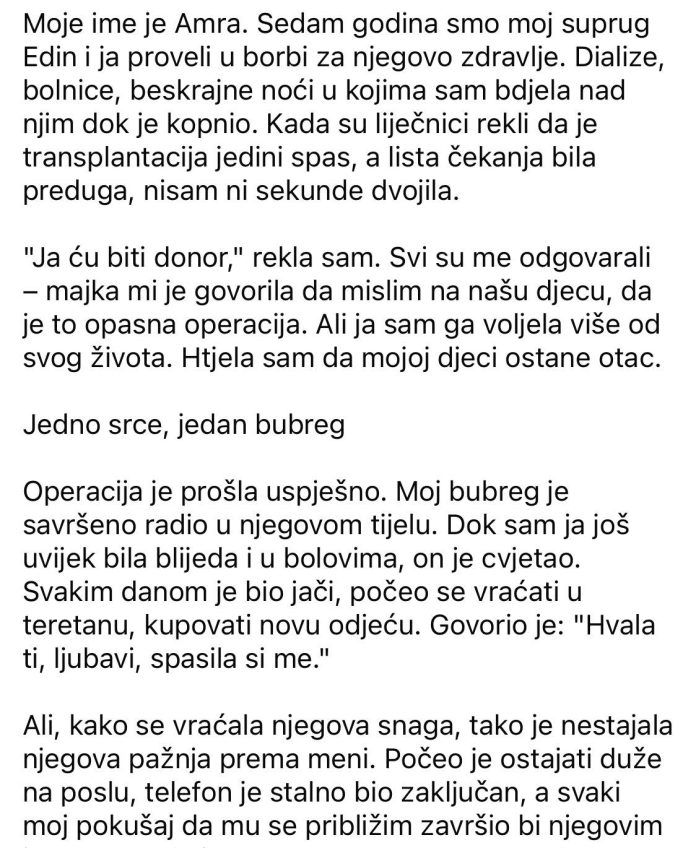 Moje ime je Amra. Sedam godina smo moj suprug Edin i ja proveli u borbi za njegovo zdravlje. Dialize, bolnice, beskrajne noći u kojima sam bdjela nad njim dok je kopnio. Kada su liječnici rekli da je transplantacija jedini spas, a lista čekanja bila preduga, nisam ni sekunde dvojila. “Ja ću biti donor,” rekla sam. Svi su me odgovarali – majka mi je govorila da mislim na našu djecu, da je to opasna operacija. Ali ja sam ga voljela više od svog života. Htjela sam da mojoj djeci ostane otac. Jedno srce, jedan bubreg Operacija je prošla uspješno. Moj bubreg je savršeno radio u njegovom tijelu. Dok sam ja još uvijek bila blijeda i u bolovima, on je cvjetao.