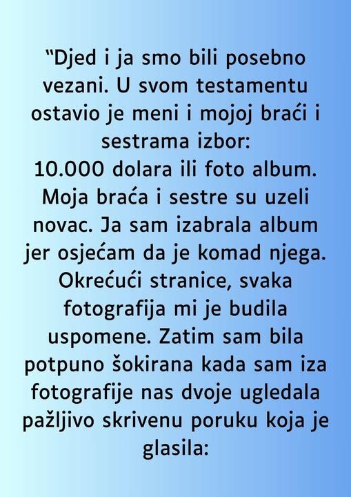 Hvala ti što si shvatila pravu vrijednost naših uspomena i što si izabrala ljubav umjesto materijalnog bogatstva. Uvijek ćeš biti moja dragocjena unuka.”