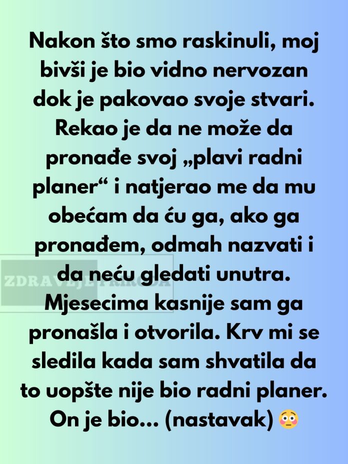 Nakon što smo raskinuli, moj bivši je bio vidno nervozan dok je pakovao svoje stvari. Rekao je da ne može pronaći svoj „plavi radni planer“ i natjerao me da mu obećam da ću ga, ako ga pronađem, direktno nazvati i da ne gledam unutra.