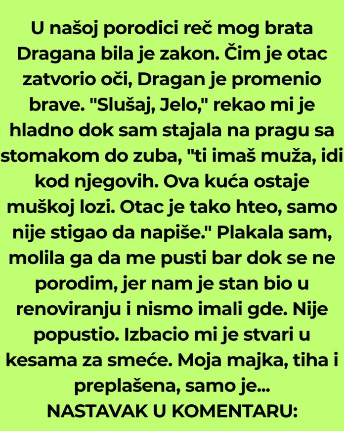 U našoj porodici reč mog brata Dragana bila je zakon. Čim je otac zatvorio oči, Dragan je promenio brave. “Slušaj, Jelo,” rekao mi je hladno dok sam stajala na pragu sa stomakom do zuba, “ti imaš muža, idi kod njegovih. Ova kuća ostaje muškoj lozi. Otac je tako hteo, samo nije stigao da napiše.” Plakala sam, molila ga da me pusti bar dok se ne porodim, jer nam je stan bio u renoviranju i nismo imali gde. Nije popustio. Izbacio mi je stvari u kesama za smeće. Moja majka, tiha i preplašena, samo je oborila glavu. Umrla je od tuge pola godine kasnije, ne dočekavši da vidi unuku. Dragan je slavio. Prodao je očevu šumu, kupio besna kola i počeo da renovira kuću da napravi “vilu”.