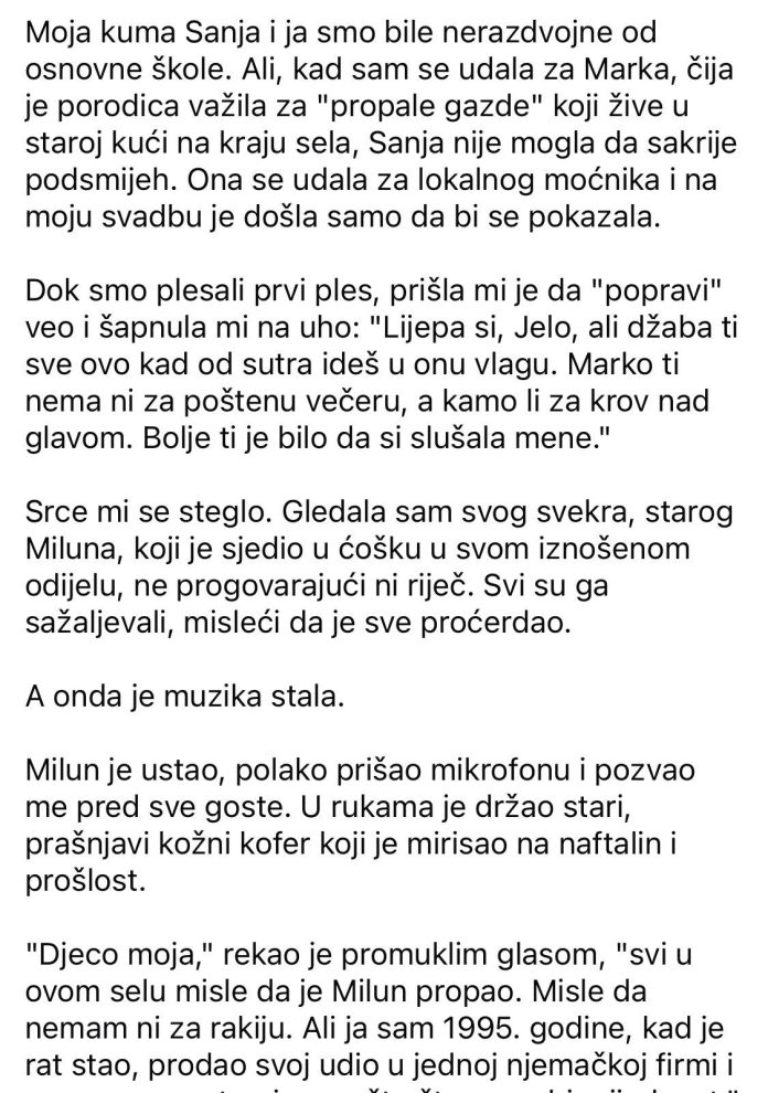 Srce mi se steglo. Gledala sam svog svekra, starog Miluna, koji je sjedio u ćošku u svom iznošenom odijelu, ne progovarajući ni riječ. Svi su ga sažaljevali, misleći da je sve proćerdao. A onda je muzika stala. Milun je ustao, polako prišao mikrofonu i pozvao me pred sve goste. U rukama je držao stari, prašnjavi kožni kofer koji je mirisao na naftalin i prošlost. “Djeco moja,” rekao je promuklim glasom, “svi u ovom selu misle da je Milun propao. Misle da nemam ni za rakiju. Ali ja sam 1995. godine, kad je rat stao, prodao svoj udio u jednoj njemačkoj firmi i sav novac pretvorio u nešto što ne gubi vrijednost.”