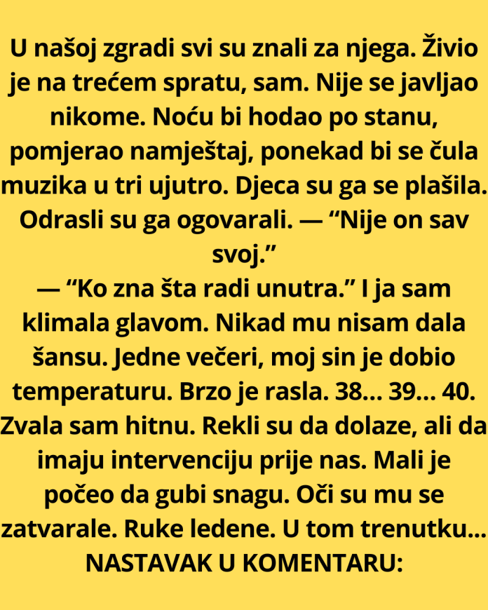 — “Ko zna šta radi unutra.” I ja sam klimala glavom. Nikad mu nisam dala šansu. Jedne večeri, moj sin je dobio temperaturu. Brzo je rasla. 38… 39… 40. Zvala sam hitnu. Rekli su da dolaze, ali da imaju intervenciju prije nas. Mali je počeo da gubi snagu. Oči su mu se zatvarale. Ruke ledene. U tom trenutku — nestalo je struje u cijeloj zgradi. Mrak. Telefon na 12%. Panika me počela gušiti. I tada — kucanje. Brzo. Odlučno. Srce mi je preskočilo. Ko sad? Otvorila sam vrata. On.