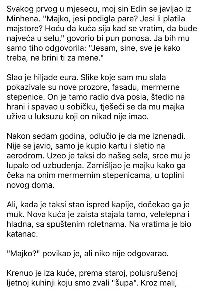 Svakog prvog u mjesecu, moj sin Edin se javljao iz Minhena. “Majko, jesi podigla pare? Jesi li platila majstore? Hoću da kuća sija kad se vratim, da bude najveća u selu,” govorio bi pun ponosa. Ja bih mu samo tiho odgovorila: “Jesam, sine, sve je kako treba, ne brini ti za mene.” Slao je hiljade eura. Slike koje sam mu slala pokazivale su nove prozore, fasadu, mermerne stepenice. On je tamo radio dva posla, štedio na hrani i spavao u sobičku, tješeći se da mu majka uživa u luksuzu koji on nikad nije imao. Nakon sedam godina, odlučio je da me iznenadi. Nije se javio, samo je kupio kartu i sletio na aerodrom. Uzeo je taksi do našeg sela, srce mu je lupalo od uzbuđenja. Zamišljao je majku kako ga čeka na onim mermernim stepenicama, u toplini novog doma.