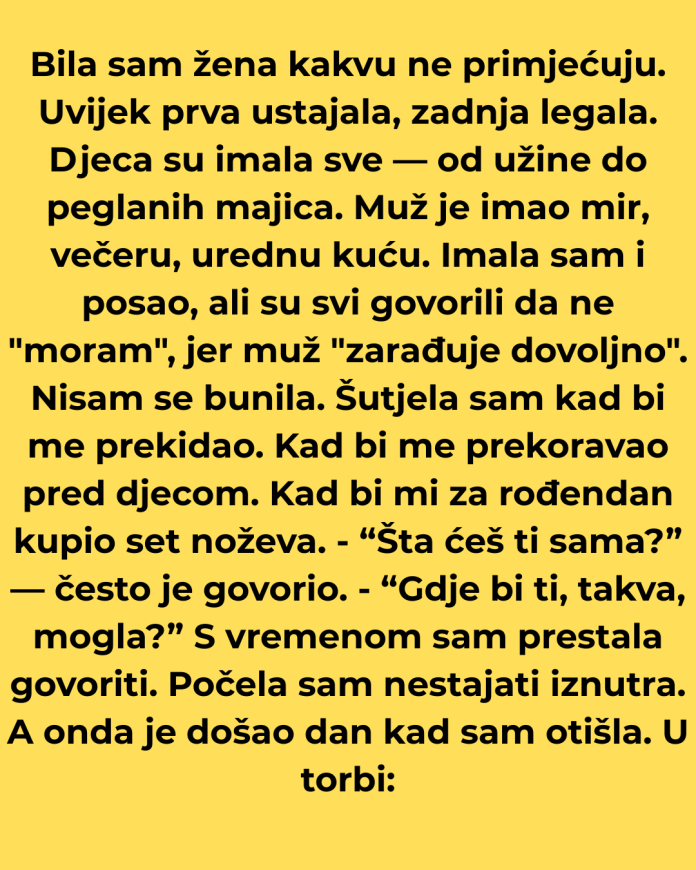 Bila sam žena kakvu ne primjećuju. Uvijek prva ustajala, zadnja legala. Djeca su imala sve — od užine do peglanih majica. Muž je imao mir, večeru, urednu kuću. Imala sam i posao, ali su svi govorili da ne “moram”, jer muž “zarađuje dovoljno”. Nisam se bunila. Šutjela sam kad bi me prekidao. Kad bi me prekoravao pred djecom. Kad bi mi za rođendan kupio set noževa. – “Šta ćeš ti sama?” — često je govorio. – “Gdje bi ti, takva, mogla?” S vremenom sam prestala govoriti. Počela sam nestajati iznutra. A onda je došao dan kad sam otišla. U torbi: par stvari, dokumenti, i tišina. Nisam ostavila poruku. Nisam zvala. Samo sam otišla. Tri dana su šutjeli.