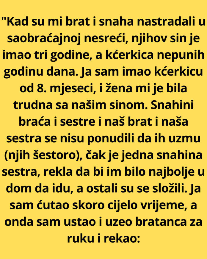 “Kad su mi brat i snaha nastradali u saobraćajnoj nesreći, njihov sin je imao tri godine, a kćerkica nepunih godinu dana. Ja sam imao kćerkicu od 8. mjeseci, i žena mi je bila trudna sa našim sinom. Snahini braća i sestre i naš brat i naša sestra se nisu ponudili da ih uzmu (njih šestoro), čak je jedna snahina sestra, rekla da bi im bilo najbolje u dom da idu, a ostali su se složili. Ja sam ćutao skoro cijelo vrijeme, a onda sam ustao i uzeo bratanca za ruku i rekao: “Dođi, ja ću brinuti o tebi. Kako bude mojoj djeci, biće i vama.”