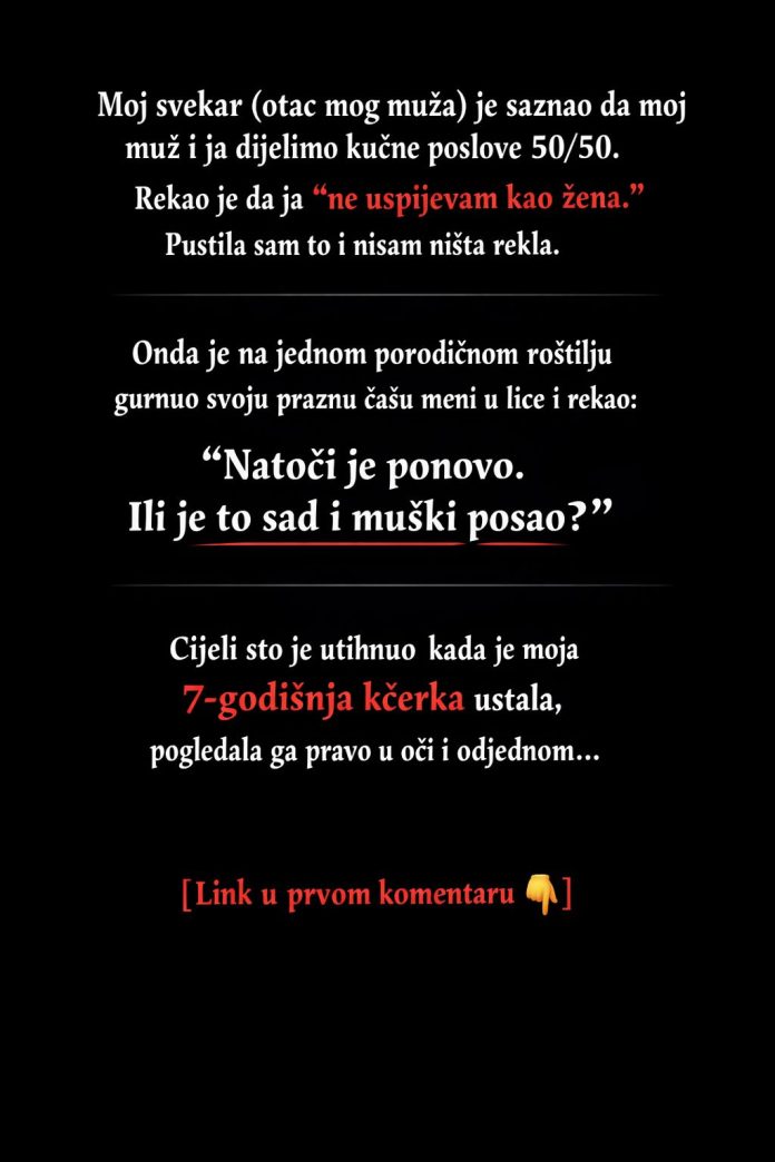 Kada je moj svekar čuo da moj muž i ja dijelimo kućne poslove 50/50, rekao je da ja “ne uspijevam kao žena.” Ja sam to samo nasmijano ignorisala.