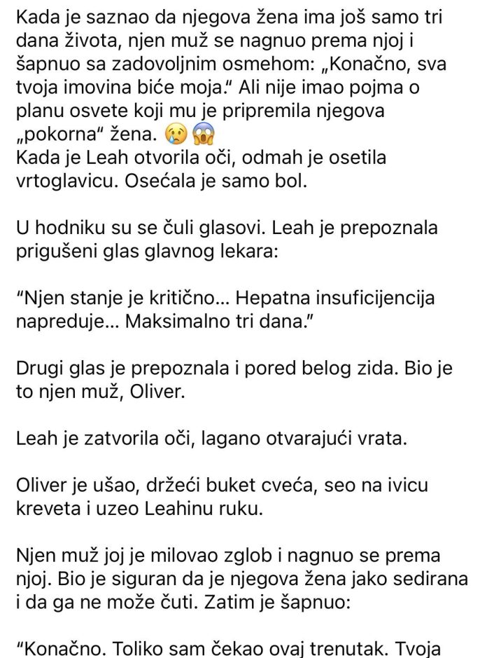 Saznavši da njegova žena ima još samo tri dana života, muž se nagnuo prema njoj i prošaputao sa zadovoljanim osmehom: „Konačno, sva tvoja imovina biće moja.“