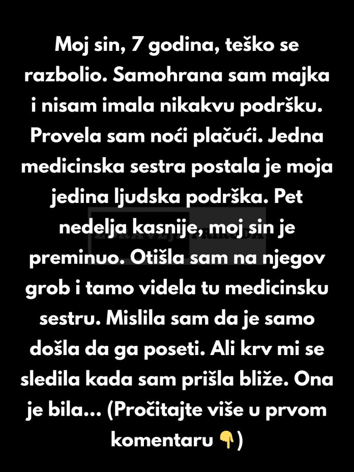 Pet nedelja kasnije, moj sin je umro. Otišla sam na njegov grob u svoju svakodnevnu posetu i videla tu medicinsku sestru kako ide tamo. Stajala sam iza drveta i posmatrala je. Plakala je.