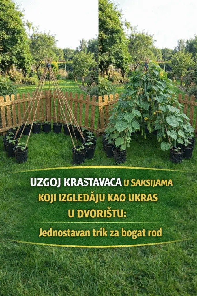 Krastavci se mogu vrlo uspješno uzgajati i u saksijama, a uz malo kreativnosti mogu postati i prava dekoracija u dvorištu ili bašti. Kao što se vidi na slici, nekoliko saksija raspoređenih u krug i povezane drvenim štapovima mogu stvoriti zanimljivu konstrukciju po kojoj će se krastavci penjati dok rastu.
