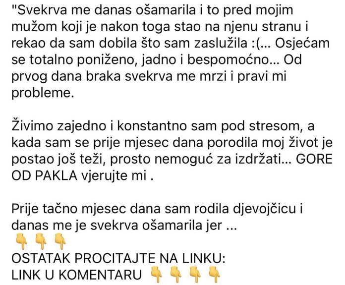 “Svekrva me danas ošamarila i to pred mojim mužom koji je nakon toga stao na njenu stranu i rekao da sam dobila što sam zaslužila :(… Osjećam se totalno poniženo, jadno i bespomoćno… Od prvog dana braka svekrva me mrzi i pravi mi probleme. Živimo zajedno i konstantno sam pod stresom, a kada sam se prije mjesec dana porodila moj život je postao još teži, prosto nemoguć za izdržati… GORE OD PAKLA vjerujte mi . Prije tačno mjesec dana sam… rodila djevojčicu i danas me je svekrva ošamarila jer sam se protivila da se mojoj djevojčici stavljaju minđušice, još je mala i jednostavno se plašim za nju, ali moja svekrva se drži nekih tradicionalnih običaja i prosto je opčinjena da mojoj djevojčici,svojoj unuci stavi zlatne minđušice. Prvi put nakon dvije godine braka sam odgovorila na svekrvine provokacije i maltretiranja, ali sve što sam dobila bio je taj šamar, nakon čega su svekrva i moj muž ipak odveli moju princezu kod zlatara, probušili joj uši i stavili te famozne zlatne minđušice koje će je kako kaže ČUVATI OD ZLA Srce mi puca kada god pogledam u njene uši, samo kada zamislim koju bol je morala da doživi zbog gluposti, uh…”