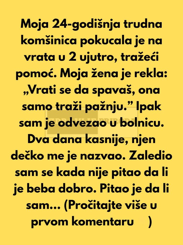Moja 24-godišnja trudna komšinica pokucala mi je na vrata u 2 ujutro tražeći pomoć. Moja žena se takođe probudila i iskreno bila iznervirana jer se to već ranije dešavalo. Rekla je: „Vrati se da spavaš, ona samo traži pažnju.”