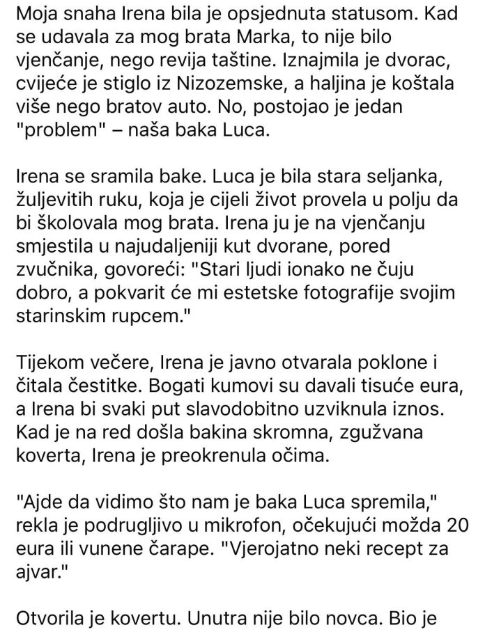 Moja snaha Irena bila je opsjednuta statusom. Kad se udavala za mog brata Marka, to nije bilo vjenčanje, nego revija taštine. Iznajmila je dvorac, cvijeće je stiglo iz Nizozemske, a haljina je koštala više nego bratov auto. No, postojao je jedan “problem” – naša baka Luca. Irena se sramila bake. Luca je bila stara seljanka, žuljevitih ruku, koja je cijeli život provela u polju da bi školovala mog brata. Irena ju je na vjenčanju smjestila u najudaljeniji kut dvorane, pored zvučnika, govoreći: “Stari ljudi ionako ne čuju dobro, a pokvarit će mi estetske fotografije svojim starinskim rupcem.” Tijekom večere, Irena je javno otvarala poklone i čitala čestitke. Bogati kumovi su davali tisuće eura, a Irena bi svaki put slavodobitno uzviknula iznos. Kad je na red došla bakina skromna, zgužvana koverta, Irena je preokrenula očima.