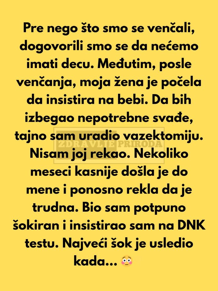 U svakom slučaju, insistirao sam na DNK testu tokom trudnoće, ne ostavljajući joj izbora osim da pristane. Najveći šok je bio kada su stigli rezultati: ispostavilo se da je dete moje, što znači da moja vazektomija možda nije bila uspešna.