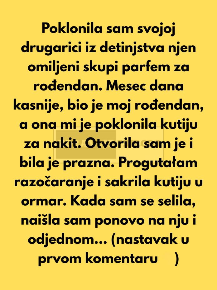 Poklonila sam drugarici skupi parfem za rođendan. Mesec kasnije, ona meni pokloni kutiju za nakit — praznu. Sakrila sam je razočarana.