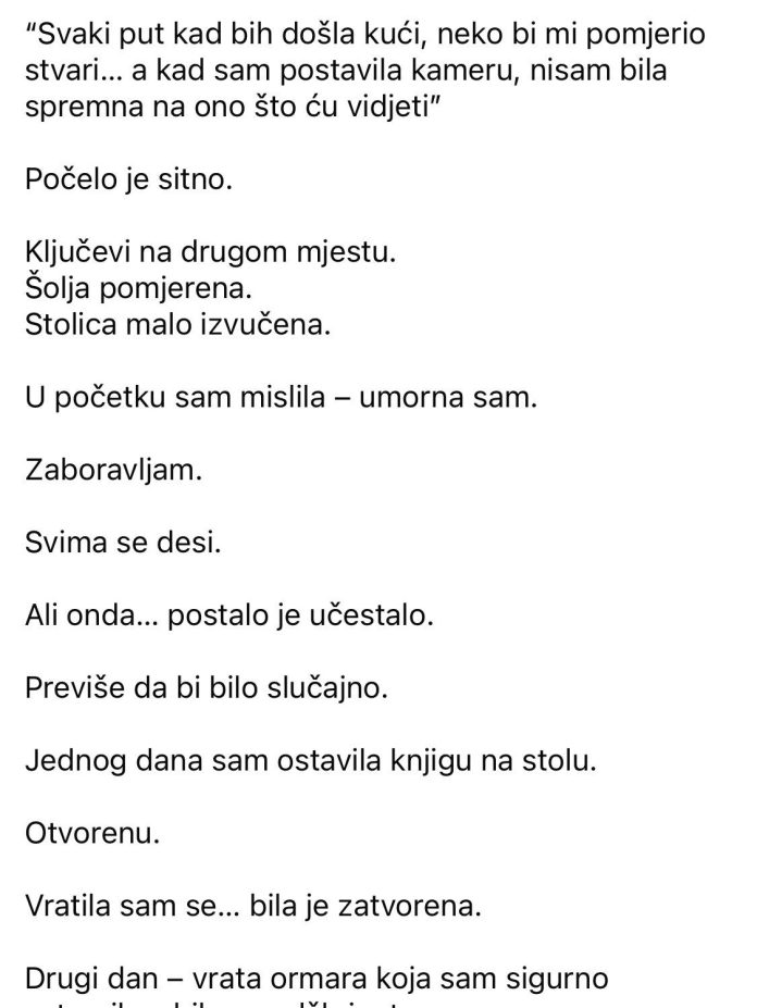 Stolica malo izvučena. U početku sam mislila – umorna sam. Zaboravljam. Svima se desi. Ali onda… postalo je učestalo. Previše da bi bilo slučajno. Jednog dana sam ostavila knjigu na stolu. Otvorenu. Vratila sam se… bila je zatvorena. Drugi dan – vrata ormara koja sam sigurno zatvorila… bila su odškrinuta. Počela sam osjećati nelagodu. Onaj tihi strah… koji ne znaš objasniti. Pitala sam komšije. Ništa. Niko ništa nije vidio. Zaključavala sam vrata.