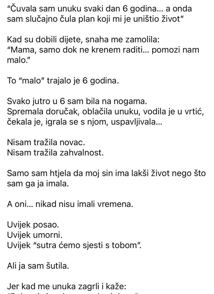 “Zašto si to uradila?” Samo sam odgovorila: “Nisam ja to uradila tog dana kod notara…” Napravila sam pauzu. I dodala: “UradiI ste vi… onog dana u kuhinji.” Od tada je prošlo godinu dana. Snaha me više ne zove. Sin dođe ponekad. Sjedi. Šuti. Ode. A unuka… Ona i dalje trči prema meni, grli me i kaže: “Bako, ti si moja mama broj jedan.” I znaš šta? Na kraju… Nisam izgubila porodicu. Samo sam konačno vidjela