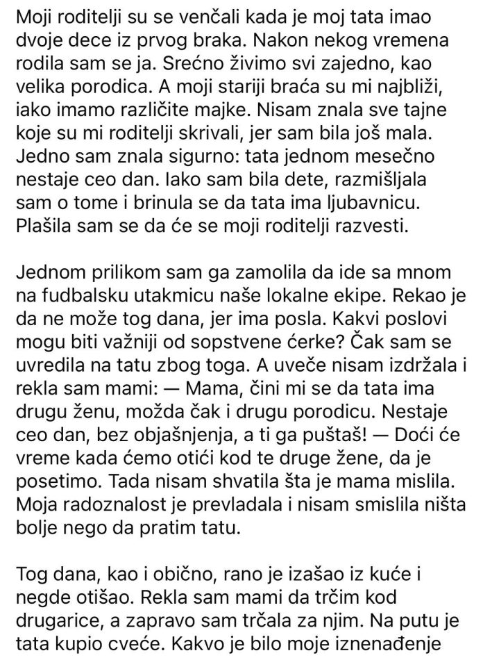 Jednom prilikom sam ga zamolila da ide sa mnom na fudbalsku utakmicu naše lokalne ekipe. Rekao je da ne može tog dana, jer ima posla. Kakvi poslovi mogu biti važniji od sopstvene ćerke? Čak sam se uvredila na tatu zbog toga. A uveče nisam izdržala i rekla sam mami: — Mama, čini mi se da tata ima drugu ženu, možda čak i drugu porodicu. Nestaje ceo dan, bez objašnjenja, a ti ga puštaš! — Doći će vreme kada ćemo otići kod te druge žene, da je posetimo. Tada nisam shvatila šta je mama mislila. Moja radoznalost je prevladala i nisam smislila ništa bolje nego da pratim tatu. Tog dana, kao i obično, rano je izašao iz kuće i negde otišao. Rekla sam mami da trčim kod drugarice, a zapravo sam trčala za njim. Na putu je tata kupio cveće. Kakvo je bilo moje iznenađenje kada sam videla da je tata otišao na groblje. — Zašto mu je tako rano na groblju? — pomislila sam. Tata je prišao nekoj grobnici, stavio cveće, zapalio sveću i seo na klupu. Tako je sedeo nekoliko sati, nepomično. Dosadilo mi je da ga posmatram i, zbunjena, vratila sam se kući. Kod kuće sam odmah pitala mamu kod koga tata ide na groblje, na šta mi je mama rekla: