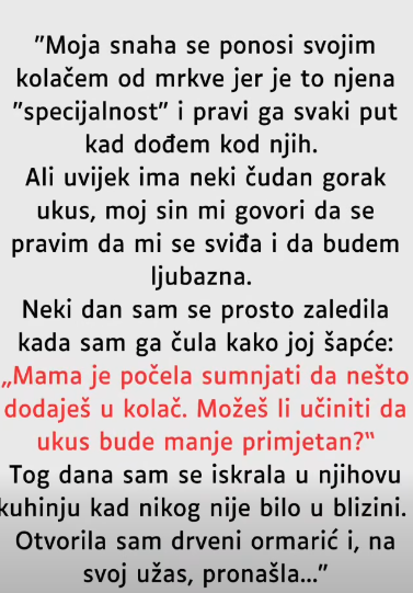 Neki dan sam se prosto zaledila kada sam ga čula kako joj šapće: „Mama je počela sumnjati da nešto dodaješ u kolač. Možeš li učiniti da ukus bude manje primjetan?“