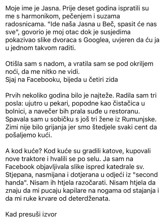 Moje ime je Jasna. Prije deset godina ispratili su me s harmonikom, pečenjem i suzama radosnicama. “Ide naša Jasna u Beč, spasit će nas sve”, govorio je moj otac dok je susjedima pokazivao slike dvoraca s Googlea, uvjeren da ću ja u jednom takvom raditi. Otišla sam s nadom, a vratila sam se pod okriljem noći, da me nitko ne vidi.