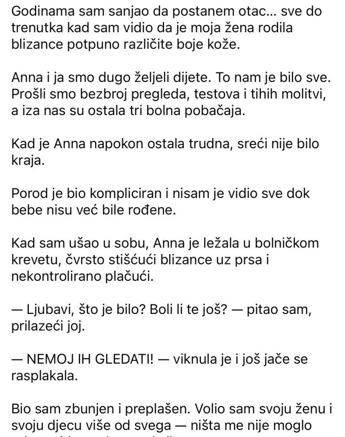 Kad mi je supruga rodila blizance s potpuno različitim tonovima kože, sve što sam mislio da znam o svom životu počelo se raspetljavati. Kako su se šaputanja širila, a pitanja postajala sve glasnija, otkrila sam istinu koja me prisilila da preispitam sve – obitelj, povjerenje i što ljubav zapravo znači. Da mi je netko rekao da će rođenje moje djece natjerati strance da preispituju moj brak – i da će pravo objašnjenje otkriti skrivenu prošlost koju moja supruga nikada nije namjeravala otkriti – nasmijao bih se tome. Ali u trenutku kada me Anna zamolila da ne gledam naše novorođene sinove, znao sam da me s druge strane tog trenutka čeka nešto nezamislivo. Nešto što će testirati ne samo moje razumijevanje znanosti, već i granice povjerenja unutar obitelji. Anna i ja smo godinama čekali dijete. Izdržali smo beskrajne liječničke preglede, bolne pretrage i tihe molitve šaputane u mraku. Tri pobačaja su nas zamalo slomila, ostavljajući za sobom emocionalne ožiljke koji nikada nisu u potpunosti zacijelili. Pokušao sam ostati jak zbog nje, ali ponekad bih našao Annu samu u kuhinji kasno navečer, kako sjedi na podu s rukama na trbuhu, šapućući djetetu koje još nismo upoznali. Stoga, kad je konačno ponovno ostala trudna – i kad nam je liječnik rekao da se možemo nadati – dopustili smo si da ponovno vjerujemo u sreću. Svaka mala prekretnica osjećala se kao čudo. Prvi udarac. Njezin smijeh dok je balansirala zdjelu na trbuhu. Ja kako naglas čitam priče našem nerođenom djetetu kao da nas već čuje. Do trenutka kada je došao termin, svi oko nas bili su spremni za slavlje. Uložili smo sva svoja srca u ovaj trenutak. Porođaj je bio neodoljiv – glasovi su vikali upute, aparati su pištali, Anna je plakala od boli. Prije nego što sam išta uspjela shvatiti, odveli su je, a ja sam ostala sama u hodniku, koračala i molila se. Kad su mi napokon dopustili da uđem u sobu, Anna se tresla pod oštrim bolničkim svjetlima, čvrsto stežući dva sićušna svežnja u rukama.