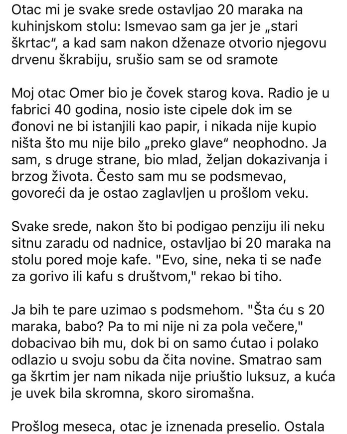 Otac mi je svake srede ostavljao 20 maraka na kuhinjskom stolu: Ismevao sam ga jer je „stari škrtac“, a kad sam nakon dženaze otvorio njegovu drvenu škrabiju, srušio sam se od sramote