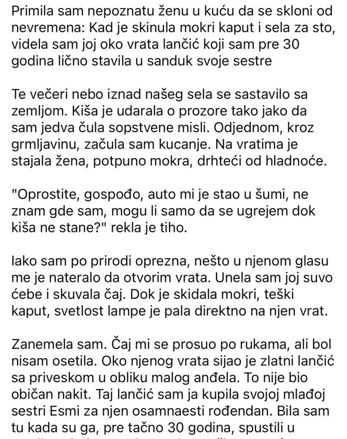 Primila sam nepoznatu ženu u kuću da se skloni od nevremena: Kad je skinula mokri kaput i sela za sto, videla sam joj oko vrata lančić koji sam pre 30 godina lično stavila u sanduk svoje sestre Te večeri nebo iznad našeg sela se sastavilo sa zemljom. Kiša je udarala o prozore tako jako da sam jedva čula sopstvene misli. Odjednom, kroz grmljavinu, začula sam kucanje. Na vratima je stajala žena, potpuno mokra, drhteći od hladnoće. “Oprostite, gospođo, auto mi je stao u šumi, ne znam gde sam, mogu li samo da se ugrejem dok kiša ne stane?” rekla je tiho. Iako sam po prirodi oprezna, nešto u njenom glasu me je nateralo da otvorim vrata. Unela sam joj suvo ćebe i skuvala čaj. Dok je skidala mokri, teški kaput, svetlost lampe je pala direktno na njen vrat.
