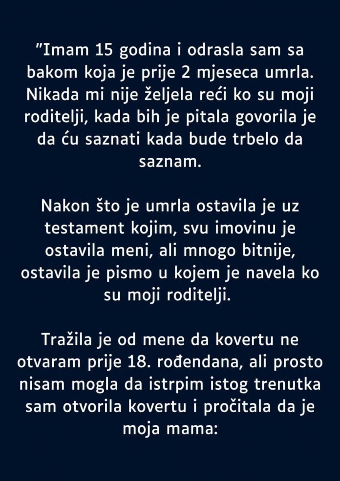 “Imam 15 godina i odrasla sam sa bakom koja je prije 2 mjeseca umrla. Nikada mi nije željela reći ko su moji roditelji, kada bih je pitala govorila je da ću saznati kada bude trbelo da saznam.