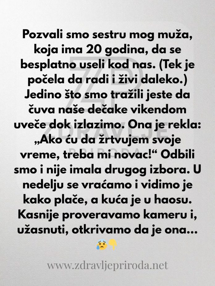 Pozvali smo sestru mog muža, koja ima 20 godina, da živi kod nas besplatno. (Tek je počela da radi i živi daleko.) Sve što smo tražili bilo je da čuva naša dvogodišnja blizanca vikendom uveče dok mi izlazimo. Ona je rekla: „I ja imam život! Ako treba da žrtvujem svoje vreme, treba mi novac!“ Odbila sam, i nije imala drugog izbora nego da prihvati, i mesecima je sve funkcionisalo kako treba.