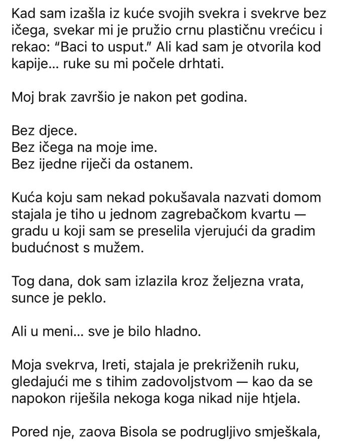 Nisam ništa tražila. Nisam se svađala niti plakala. Sve što sam nosila bila je mala torbica i posljednji komadić dostojanstva koji nisam htjela napustiti.