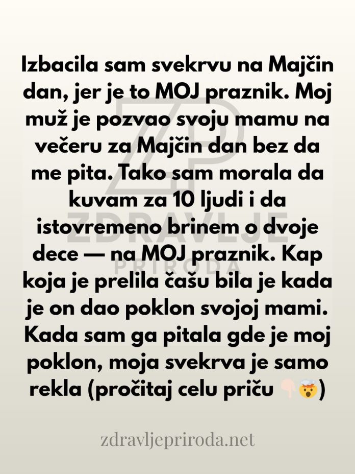 „Tek kasnije, kada je kuća utihnula i kada sam konačno ostala sama, dozvolila sam sebi da zaplačem. Majčin dan je trebao biti dan slavlja, ali za mene se pretvorio u dan frustracije i ogorčenosti. Ispostavilo se da moj muž nije ni pomislio da mi kupi poklon.