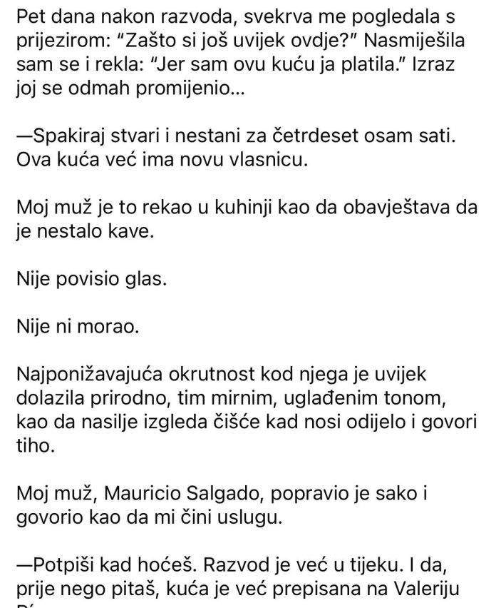 Pet dana nakon razvoda, moja svekrva me pogledala s prezirom: „Zašto si još uvijek ovdje?“ Nasmiješila sam se i odgovorila: „Zato što sam ja platila ovu kuću.“ Izraz lica joj se u trenu promijenio…