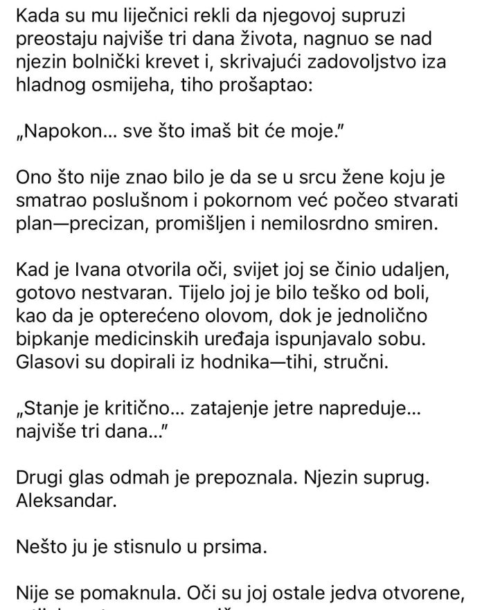 Kada je Ivana otvorila oči, svijet joj se činio dalekim, gotovo nestvarnim. Tijelo joj je bilo teško, kao da je od olova, dok je ravnomjerno bipkanje bolničkih uređaja ispunjavalo sobu. Iz hodnika su dopirali tihi, profesionalni glasovi.