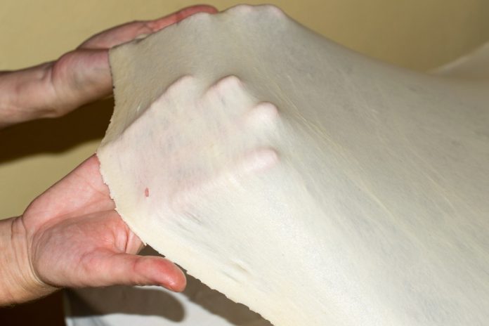 Prebacite testo na sto. Prvo rukama razdvojite koru od centra. Pokušajte lagano vrhovima prstiju razvući tijesto da ga slučajno ne probušite. Nastavite mazati po stolu dok ne postanu tanki i gotovo providni. Dopunite ih po potrebi. Podignite stolnjak, savijte krajeve kore za pitu u pravougaonik i pomoću stolnjaka zarolajte pitu.