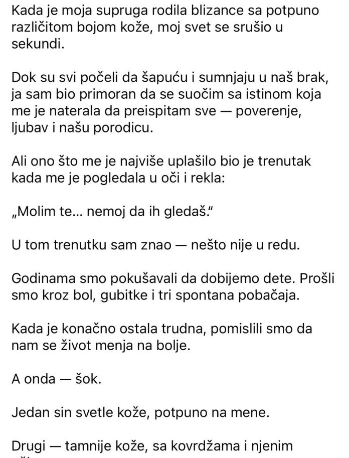 Nakon porođaja, situacija je postala neobična. Majka je bila uznemirena i molila je da otac ne pogleda bebe odmah. Kada ih je ipak vidio, uslijedio je šok – blizanci su izgledali potpuno različito.