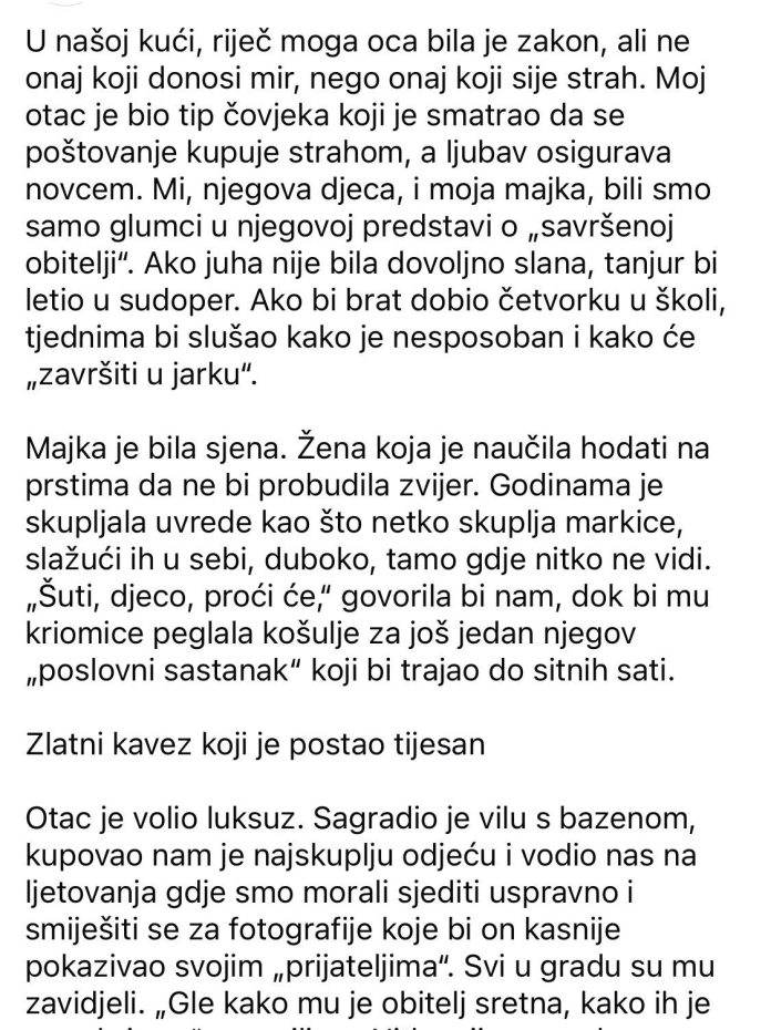 Otac je volio luksuz. Sagradio je vilu s bazenom, kupovao nam je najskuplju odjeću i vodio nas na ljetovanja gdje smo morali sjediti uspravno i smiješiti se za fotografije koje bi on kasnije pokazivao svojim „prijateljima“. Svi u gradu su mu zavidjeli. „Gle kako mu je obitelj sretna, kako ih je sve zbrinuo,“ govorili su. Nitko nije znao da smo u tom zlatnom kavezu svi bili samo robovi njegove volje.