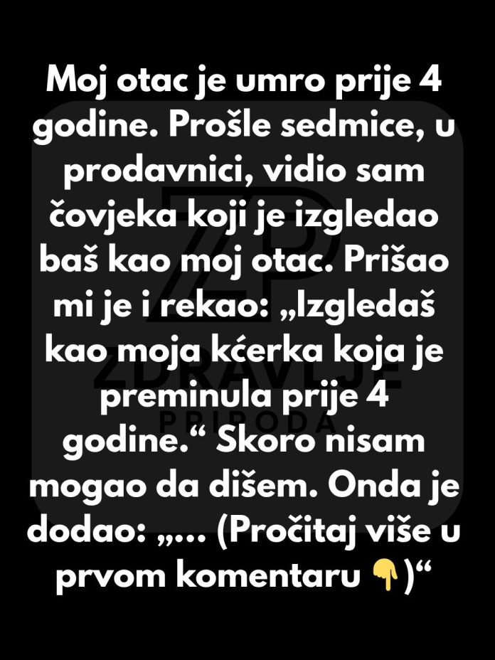 On se okrenuo i pogledao me. Zatim je prišao — što stranci obično ne rade — i tiho rekao: „Izgledaš tačno kao moja kćerka koja je preminula prije 4 godine.“ Nisam mogao da dišem. Stajali smo tamo, u sred prolaza u prodavnici, dvoje ljudi koji nose isti oblik gubitka, samo smo se gledali.