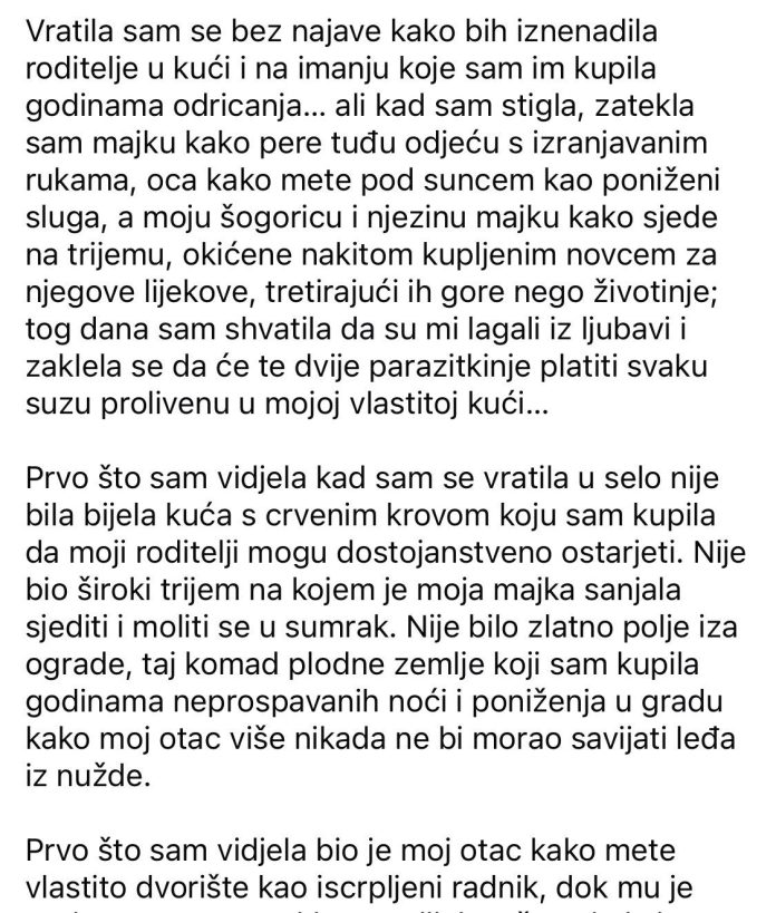 Jer sam pola mladosti provela radeći kao mazga u gradu. Trpila sam prezir, dvostruke smjene i šefove koji su mislili da samo zato što je djevojka došla sa sela, ne može samostalno razmišljati. Uštedjela sam svaki peni. Odrekla sam se haljina, odmora, dečkiju, odmora. Sve kako bih roditeljima kupila utočište gdje bi mogli ostarjeti poput skromnih kraljeva. I dok sam si lomila leđa, vjerujući da su u miru, oni su pretvoreni u sluge u kući koju sam im dala.