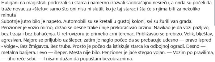 Subotnje jutro počelo je kao i svako drugo. Nebo je bilo sivo, asfalt vlažan, a kolone vozila kretale su se prema izlazu iz grada. U toj svakodnevnoj gužvi, jedan penzioner vozio je mirno i oprezno svoju staru Volgu, poštujući saobraćajna pravila i držeći propisano odstojanje.