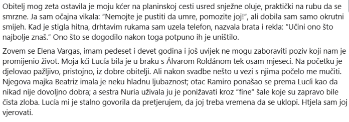 Álvaro je problijedio. Pokušao je poreći, opravdati, okriviti svoju obitelj. Prekasno. Tužba je uslijedila, a odvjetnik kojeg smo angažirali potvrdio je da se to može klasificirati kao napuštanje koje je rezultiralo teškom ozljedom i nepružanjem pomoći. Tada je s druge strane počela prava panika: pozivi, poruke, pritisak, čak i ponuda novca za Lucíju kako bi “izbjegla skandal”. Tada sam shvatio nešto gore od njihove okrutnosti: nisu se kajali; bojali su se posljedica . I još uvijek nisu znali da Hector čuva još jedan dokaz, onaj koji će jednom zauvijek uništiti verziju cijele obitelji. Dio 3 Dokazi su se pojavili u pravom trenutku. Héctor je zatražio kopije Lucíjinih i Álvarovih zapisa poziva i poruka od te noći, a pronašao je i objavu za koju je Nuria smatrala prolaznom i nevažnom: privatnu priču na društvenim mrežama, podijeljenu samo s malom grupom prijatelja. Jedan od tih ljudi, ogorčen saznanjem što se dogodilo, snimio je zaslon prije nego što je nestao. Slika je prikazivala prozor automobila prekriven snijegom, a u pozadini Lucíjinu zamagljenu siluetu na cesti. Iznad nje, Nuria je napisala: „Kraljica drame vodi predstavu u planine“ pored smijućeg emotikona. Kad sam to vidio, osjetio sam mješavinu ljutnje i olakšanja. Ljutnju zbog zlobe. Olakšanje jer se više nisu mogli skrivati iza elegantnih laži. Odvjetnik je predočio te dokaze zajedno s ostatkom materijala: svjedočanstvima, snimkama sigurnosnih kamera, medicinskim izvještajima, lokacijom vozila i naknadnim porukama. Obrana obitelji Roldán pokušala je tvrditi da je sve bila svađa s “impulzivnim odlukama”, ali Nurijina objava uništila je svaki takav argument. Nije bilo slučajnosti ili nesporazuma: bilo je prezira, ruganja i namjernog napuštanja. Álvaro se prvi slomio. Zatražio je sastanak s Lucíjom nasamo kako bi se “objasnio”, ali ona je odbila. Poslala mu je samo jedan odgovor preko svog odvjetnika: “Ne trebaju mi objašnjenja od nekoga tko me vidio na rubu smrti i nije otvorio vrata.” Ta se fraza proširila među našim poznanicima i ubrzo je cijela Granada pričala o slučaju. Roldánovi, toliko opsjednuti reputacijom, vidjeli su kako se njihovo ime povezuje s okrutnošću koju je bilo nemoguće prikriti. Ramiro je gubio ugovore. Beatriz je prestala pojavljivati se na društvenim događanjima. Nuria je ugasila svoje račune na društvenim mrežama. A Álvaro, koji je oduvijek udobno živio u sjeni svoje obitelji, na kraju je ostao sam, izoliran i suočen s pravnim postupkom koji više nije mogao kontrolirati.