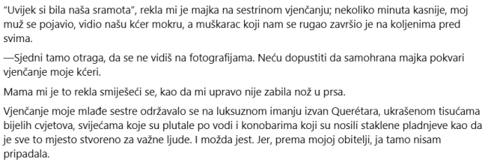 1. DIO „Sjedni tamo, gdje nećeš biti na slikama. Neću dopustiti da samohrana majka uništi vjenčanje moje kćeri.“ Mama mi je to rekla s osmijehom, kao da me upravo nije ubola u prsa. Vjenčanje moje mlađe sestre održano je u luksuznoj hacijendi izvan Querétara, ukrašenoj tisućama bijelog cvijeća, svijećama koje su plutale u reflektirajućim bazenima i konobarima koji su hodali okolo s kristalnim pladnjevima kao da je cijelo mjesto stvoreno za važne ljude. I možda je i bilo. Jer, prema mojoj obitelji, ja tamo nisam pripadala. Poslali su me za skriveni stol pored prostora za posluživanje, blizu toaleta i daleko od plesnog podija, kao da sam neka vrsta sramote koju treba pokriti stolnjacima i distancom. Moja četverogodišnja kći Sofi sjedila je pokraj mene i crtala po ubrusu bojicom koju joj je konobarica dala iz sažaljenja. Nisu joj dali dječji pribor. Nisu je uključili na obiteljske fotografije. Nisu je čak ni pitali je li jela. Moja sestra Camila zaista je blistala poput kraljice. Smiješila se ispod skupe haljine, ponosna što se udala za Juliána, poznatog poslovnog čovjeka u Monterreyu, jednog od onih muškaraca koji se pojavljuju u poslovnim časopisima i govore kao da je svijet njihov. Moja majka je bila fascinirana. I moj otac. U njihovim očima, Camila je sve učinila kako treba. Udala se “kako treba”, s novcem, prestižnim imenom i svijetlom budućnošću. Ja ne. Bila sam kći koja se prije pet godina vratila kući trudna i nikada nije otkrila tko joj je otac. Kći koja je odustala od magisterija. Kći koja je odabrala šutnju umjesto objašnjenja. Od tada sam postala oličenje svega što kažu da žena ne bi trebala biti. Mama se nagnula prema meni, namještajući svoju bisernu ogrlicu. „Tvoja sestra je znala kako birati“, rekla mi je tihim glasom. „Udala se za pravog muškarca, moćnog čovjeka, uglednog čovjeka. Ne kao što si ti, koji nam donosiš samo sramotu.“ Pogledao sam je bez odgovora. Više nisam imao snage za raspravu. Samo sam pogladila Sofi po kosi, a ona mi se nasmiješila, ne shvaćajući ništa. „Došla sam jer me Camila pozvala“, konačno sam rekla. Moja mama se suho nasmijala. „Pozvala te je kako ljudi ne bi pitali zašto joj sestra nije došla. Ali nemoj brkati uljudnost s ljubavlju. I drži tu djevojku pod kontrolom. Ne želim scenu.“ Odmah je otišla, podižući čašu šampanjca i pozdravljajući bogate goste istim ustima kojima su mene upravo ponizili. Duboko sam udahnula. Izvadila sam mobitel iz torbe i utipkala poruku.