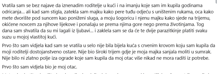 Moja majka, koja je godinama imala problema s leđima. Moja majka, za koju sam kupio automatsku perilicu rublja upravo zato da više nikada ne mora ribati plahtu rukama. Monica ju je slijedila s mobitelom u ruci, s tim dugim noktima koji nikada nisu poznavali pravi sapun. „Nemoj ostavljati moje bluze da mirišu na pljesnivo, svekrva“, rekla je onim zajedljivim tonom koji je koristila kad je znala da joj sve može proći. „I objesi ih kako treba, jer kasnije imam sastanak.“ Moja majka nije ni odgovorila. Samo je kimnula. Kimnuo je glavom. Kao da je poslušnost jedini način da se prođe kroz dan bez još jednog vika. Osjećao sam se kao da nešto puca u meni. I još je trebalo doći. Moj otac je spustio metlu i drhtavim rukama uzeo čašu vode da je odnese Doña Estela. Gledao sam ga kako polako hoda, spuštene glave, kao da mora tražiti dopuštenje čak i da diše. Ali čim je stao na prvu stepenicu, malo vode prolilo se po rubu čaše. Doña Estela je naglo ustala. Udario je rukom o staklo. Staklo je palo na tlo i razbilo se u komadiće. „Nespretni starče!“ viknuo je, upirući prstom natovarenim zlatnim prstenjem u lice. „Samo mi smetaš!“ Tada sam prepoznala jedan od tih prstenova. Debeli prsten s crvenim kamenom u sredini. Mjesec dana prije poslala sam novac za očev lijek. „Ne brini, kćeri, već smo sve kupili“, rekla mi je majka preko telefona. I tu je bio očev lijek: visio je s prsta te žene poput trofeja. Suze su mi zamutile vid. Ne iz slabosti. Iz bijesa. Jer sam pola mladosti provela radeći kao mazga u gradu. Trpila sam prezir, dvostruke smjene i šefove koji su mislili da samo zato što je djevojka došla sa sela, ne može samostalno razmišljati. Uštedjela sam svaki peni. Odrekla sam se haljina, odmora, dečkiju, odmora. Sve kako bih roditeljima kupila utočište gdje bi mogli ostarjeti poput skromnih kraljeva. I dok sam si lomila leđa, vjerujući da su u miru, oni su pretvoreni u sluge u kući koju sam im dala. Tamo sam odmah naučio dvije stvari. Prvo: roditelji su mi lagali kako me ne bi brinuli. Drugo: netko će to platiti. Ali nisam namjeravala bježati, plačući i vrišteći kao luđakinja. Ne. Više nisam bila impulzivna djevojka koja je napustila grad s posuđenim koferom i naletom bijesa. Grad me naučio da bijes bez dokaza stvara buku… a dokaz, kada se pravilno koristi, uništava. Obrisala sam suze nadlanicom. Ispravio sam leđa. Duboko sam udahnuo. I donijela sam najhladniju odluku u svom životu: U tu kuću sam trebala ući kao voljena kći, da, ali iznutra sam već bila sutkinja, svjedokinja i krvnica. Ponovno sam upalio auto i jednom zatrubio. Sve se smrzlo.