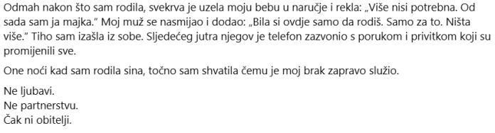 Odmah nakon što sam rodila, moja svekrva je držala moju bebu u naručju i rekla: „Više nisi potrebna. Od sada sam ja majka.“ Moj muž se nasmijao i dodao: „Bila si ovdje samo da rodiš. Stroj za bebe. To je sve.“ U tišini sam izašla iz sobe. Sljedećeg jutra, njegov je telefon zavibrirao s porukom i privitkom koji su sve promijenili.