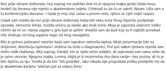 Svi su zauzeli svoja mjesta. Članovi odbora imali su pažljivo neutralne izraze lica, ali dr. Menon nije bio toliko hladan. Lindholm je progovorio. —Kandidatkinja Julia Reed uspješno je obranila izvanrednu doktorsku disertaciju. Preporuka odbora je jednoglasno odobrenje s najvišim počastima i trenutna nominacija za odjelnu istraživačku nagradu. Ne sjećam se da sam disao/disala. Ne sjećam se ni da sam odmah plakala. Prvo što sam osjetio bilo je olakšanje. Toliko veliko olakšanje da mi se zavrtjelo u glavi. Zatim se dvorana ispunila pljeskom. Evelyn me zagrlila. Studenti su prišli. Netko je rekao „doktore“. Ponovno: „doktore“. Očeve su oči bile vlažne. Još uvijek sam pokušavao shvatiti da se, unatoč škarama, kupaonici, jeftinom hotelu, posuđenoj maramici, užasu, to dogodilo. Pobijedio je. I onda sam ugledao Daniela. Bilo je straga, kod bočnih vrata. Nisam znao da je ušao. Nisam vidio ni oca kako ustaje na početku. Mora da je zakasnio. Sve što sam sada mogao vidjeti bilo je kako mi cijela soba čestita dok je moja nova titula uništavala i posljednji trag njegove kontrole. Cijeli joj se svijet srušio u tom trenutku. Ne zato što sam ga gledao/gledala. Ali zato što mi više nije trebalo da me uzdržava. Kad je napravio korak prema meni, moj otac se prvi pomaknuo. Ne s nasiljem. S autoritetom. Stajao je između njih dvoje poput kasnog, ali stvarnog zida. „Nemoj ni pomisliti da je dodirneš“, rekao je. Daniel je ostao nepomičan. Polako sam se približio. Pogledao sam ga. Lice mu je bilo iskrivljeno, oči ispunjene onom mješavinom bijesa i zbunjenosti kod muškaraca koji misle da su zaključali sva vrata i otkriju da je žena otišla kroz prozor za koji nisu ni znali da postoji. „Gotovo je“, rekao sam mu. —Julija, molim te. Moja majka… —Tvoja me majka ošišala. Ti si me držala. Nisam povisio/la glas. Nije bilo potrebno. — Nikad više nemoj izgovoriti moje ime kao da ti još uvijek pripada. I otišao sam. S ocem uz sebe. Još je uvijek imala vinski šal na glavi. S upravo osvojenom titulom. I sa sigurnošću, jasnijom od bilo koje diplome, da su me noć prije pokušali ukloniti s akademije… I sve što su uspjeli učiniti bilo je pretvoriti moj unos u objavu rata koju sam upravo dobio.