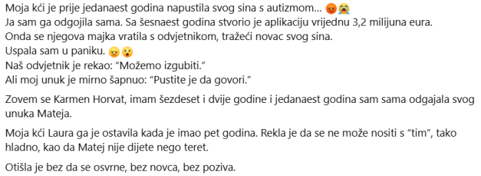 Matthew nije ni trepnuo. Sjedio je pokraj mene u odvjetničkom uredu, odjeven u svoju uobičajenu sivu majicu s kapuljačom, slušalice su mu visjele oko vrata, ruke su mu počivale na koljenima. Kad je naš odvjetnik rekao: “Mogli bismo izgubiti”, osjetila sam kako mi krv polazi iz tijela. Pogledala sam Lauru, svoju kćer, tako dotjeranu, tako namirisanu, tako samouvjerenu, s tim odvjetnikom u elegantnom odijelu pokraj nje, i na trenutak sam se opet osjećala kao ona umorna žena koja pere tuđe podove kako bi platila terapiju i bilježnice. Ali tada se moj nećak Tomás, koji je inzistirao da nas prati, lagano nagnuo prema meni i mirno šapnuo: — Neka govori. Nisam razumio što je mislio. Laura je doista pričala. Deset minuta je glumila pokajničku majku. Rekla je da je bila mlada, da je bila zbunjena, da nikada nije prestala voljeti svog sina, da jednostavno nije imala emocionalne alate za brigu o djetetu „s posebnim potrebama“. Svaku rečenicu je prožimala savršeno plasiranom suzom, odmjerenim uzdahom, onim teatralnim pauzama koje neki ljudi koriste kada vjeruju da dobro odglumljena bol vrijedi više od istine. „Nisam ovdje iz ambicije“, rekla je, čak gledajući odvjetnika kao da traži njegovo odobrenje. „Ovdje sam jer je Mateo moj sin. I kao njegova biološka majka, imam pravo zaštititi njegovo nasljedstvo.“ Baština. Kakva čista riječ za ženu koja nije ostavila ni lipe kad je nestala. Htjela sam je prekinuti. Htjela sam vikati da je Mateo imao temperaturu sa šest godina i da se od straha uhvatio za moju suknju. Da će sa sedam godina udarati glavom kad ga buka s ulice preplavi, a ja ću ga držati dok ponovno ne bude mogao polako disati. Da će s devet godina otkriti kako popraviti stari radio s dvije prazne baterije i zahrđalom žicom, a ja ću mu pljeskati kao da je izumio sunce. Ali Tomás mi je ruku gurnuo ispod stola i ponovio ne gledajući me: — Ostavite je na miru. Onda sam shvatio/la. Nije se radilo o tome da je uvjerim. Ideja je bila pustiti da samo potone. Sudac još nije ušao. Ovo je bio preliminarni sastanak za mirenje, postupak koji je ponekad rješavao stvari prije nego što se nastavi s formalnim saslušanjem. Laurin odvjetnik namjestio je naočale i stavio fascikl na stol. „Moja klijentica ne traži sukob interesa“, rekao je suhom uljudnošću. „Ona samo traži priznanje svog pravnog statusa majke i privremeno upravljanje prihodima ostvarenim iz zahtjeva, s obzirom na to da maloljetnica još nije punoljetna.“ Naš odvjetnik, dobar, ali razborit čovjek, duboko je udahnuo. „Gospođa Carmen je de facto skrbnica već jedanaest godina“, odgovorio je, „ali nažalost, potpuno ukidanje roditeljskih prava nikada nije formalno utvrđeno na sudu. Ta praznina bi nam mogla zakomplicirati stvari.“ Stisnula sam usne. Tu je ležao strah. Ne strah od gubitka novca. Strah od gubitka Matea. Jer novac, za mene, nikada nije bio blagoslov, već nova vrsta prijetnje. Otkad je aplikacija počela vrijediti milijune, manje sam spavao. Znao sam da novac privlači upravo istu stvar kao i krv: morske pse. Laura se zatim okrenula prema sinu. —Mateo, ljubavi moja, znam da ti je sve ovo zbunjujuće. Ali ovdje sam. Želim ti pomoći. Želim biti u tvom životu. Zaslužuješ imati svoju majku. Nije odgovorio. Nije je čak ni pogledao. Samo je lagano nagnuo glavu, kao kad sluša glazbeni komad i traži grešku u ritmu. Mislila je da je to sramežljivost. Osmjehnula se s lažnom nježnošću koja mi je izazvala povraćanje. „Uvijek je bilo teško stupiti u kontakt s njim“, rekla je tada, okrećući se odvjetnicima. „Njegovo stanje…“ Mateo je podigao lice. Prekinula ju je mirnim, savršeno jasnim glasom: —Nemoj me nazivati uvjetom. Laura se smrzla. I ja također. Moj unuk nije puno pričao kad bi ga nešto uznemirilo. Kao dijete, višak emocija bi ga zatvorio poput vrata. Ali sa šesnaest godina naučio je nešto drugo: kad bi odlučio progovoriti, svaka bi riječ izašla precizno.