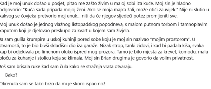 „Već dvije godine“, rekao je Ethan. „A danas nisam ovdje ni u kakvom službenom svojstvu. Ovdje sam kao njegov unuk. Zato pitam ponovno. Na čije ime je ova nekretnina registrirana?“ Htjela sam nestati. Ne zato što sam se bojala Ethana, već zato što su majke poput mene teška djeca naučila da se više boje sukoba nego okrutnosti. „Molim vas“, rekla sam, „ovo ne mora postati scena.“ Ethan me pogledao i izraz lica mu se omekšao. „Bako, ona već jest.“ Melissa se prva oporavila. „Margaret je oduvijek imala svoje mjesto ovdje. Brinemo se o njoj.“ Ethan je pogledao prema sobi iza mene. „U zasebnoj kutiji s prijenosnim grijačem, izloženim žicama i bez pristupačne kupaonice? Ima sedamdeset četiri godine.“ „Željela je neovisnost“, rekao je Brian. Ta laž je bila toliko očita da sam se skoro nasmijao. Istina je bila ružnija i daleko češća. Nakon što mi je suprug Frank umro sedam godina ranije, pustila sam Briana da se brine o svemu jer mi je tuga usporila um i zamutila ga. Rekao je da ne bih trebala živjeti sama. Rekao je da je velika kuća previše. Rekao je da će, ako prenesem vlasnički list na njegovo ime, biti lakše refinancirati i da je može preurediti kako bismo svi mogli živjeti zajedno. Bilo je papirologije. Toliko papirologije. Melissa je sjedila pokraj mene, smiješeći se i pokazujući gdje bih trebala potpisati. Vjerovala sam svom sinu jer je bio moj sin. Isprva sam imala sobu u prizemlju. Onda je Melissa zatrudnjela i htjela dječju sobu. Kasnije je došao kućni ured, pa soba za vježbanje, pa privremeni “popravci”. Svaka promjena me gurala dalje od središta kuće sve dok jednog proljetnog jutra Brian nije premjestio moju odjeću u stražnju sobu i rekao: “Tamo ću biti u miru.” Do tada, moje ime više nije bilo nigdje važno. Ethan je slušao ne prekidajući dok sam mu sve pričao, iako se sa svakom rečenicom nešto u njegovoj čeljusti stezalo. Kad sam završio, postavio je samo jedno pitanje. „Jeste li ikada imali vlastitog odvjetnika koji je pregledao prijenos vlasništva?“ “Ne.” „Jesu li ti rekli da nabaviš jedan?“ Brian se umiješao. „Dosta je. Ponašaš se kao da sam ga ja ukrao.“ Ethanove su se oči okrenule prema njemu. „Jesi li to učinio?“ „Ta kuća bi bila izgubljena bez mene.“ “To nije ono što sam pitao.” Melissa je istupila naprijed. „Mi plaćamo poreze. Plaćamo režije. Mi se brinemo o njoj.“ Prije nego što sam se uspio zaustaviti, rekao sam: “Naplaćuju mi ​​stanarinu preko socijalnog osiguranja.” Melissa je ostala nepomična. Ethan se vrlo polako okrenuo prema njoj. „Što?“ Brian je opsovao sebi u bradu. Nakon toga, sve se prelilo na drugu stranu. Melissa je upravljala mojim bankovnim računom „kako bi pomogla“. Svaki mjesec sam prebacivala većinu svog socijalnog osiguranja na njihov kućni račun za stanarinu, hranu, administraciju lijekova i ono što je ona nazivala „doprinosom za uzdržavanje“. Na tekućem računu ostala su mi četrdeset tri dolara. Četrdeset tri. Nakon četrdeset šest godina braka, nakon što sam pomogla platiti tu istu kuću, nakon što sam svako ljeto čuvala Ethana i šivala školske uniforme za Briana kad nismo imali ništa, bila sam svedena na to da tražim dopuštenje da kupim kremu za ruke. Ethan je dugo šutio, zatim izvadio mobitel i nešto utipkao. Kad je pogledala Briana i Melissu, glas joj je bio toliko čvrst da me je više uplašio nego da je vikala. „Imaju rok do sutra ujutro da dostave sve vlasničke listove, prijenosne listove, bankovne izvode i punomoći vezane uz bakine financije i ovu nekretninu.“ Brian se nasmijao. „Ili što?“ Ethan je stavio mobitel u džep kaputa. „Ili ću prestati biti ovdje samo kao njegov unuk.“ Te noći, Ethan nije ostao u kući. Rezervirao je hotel petnaest minuta dalje, ali je odbio otići prije nego što mi je pomogao spakirati mali kofer i pokupiti lijekove, osobnu iskaznicu, bankovne dokumente i metalnu kutiju u kojoj sam čuvala stare obiteljske dokumente. Brian je protestirao. Melissa je plakala. Zamalo sam dvaput popustila: jednom iz navike, jednom iz straha. Ethan je stajao kraj vrata male sobe i nježno rekao: „Bako, ne tražiš dopuštenje da pođeš sa mnom.“ Tako sam otišao.